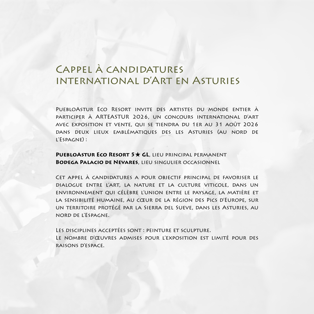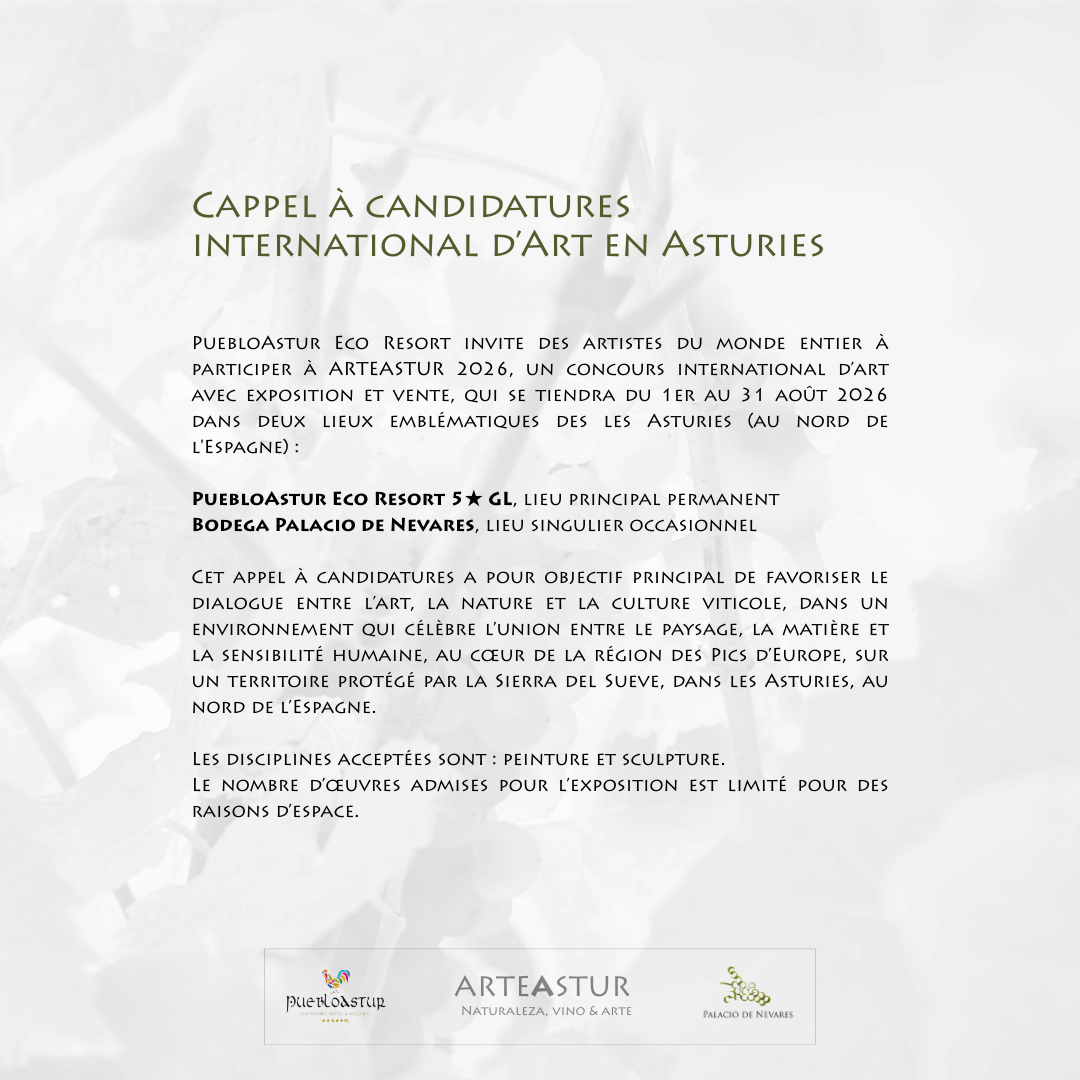 Puebloastur Eco Resort invite des artistes du monde entier à participer à ARTEASTUR 2026, un concours international avec exposition et vente, qui se tiendra du 1er au 31 août 2026 dans deux lieux emblématiques de la Principauté des Asturies (Espagne) : PuebloAstur Eco Resort 5 GL*, en tant que siège principal permanent, et la Bodega Palacio de Nevares, en tant que lieu singulier.